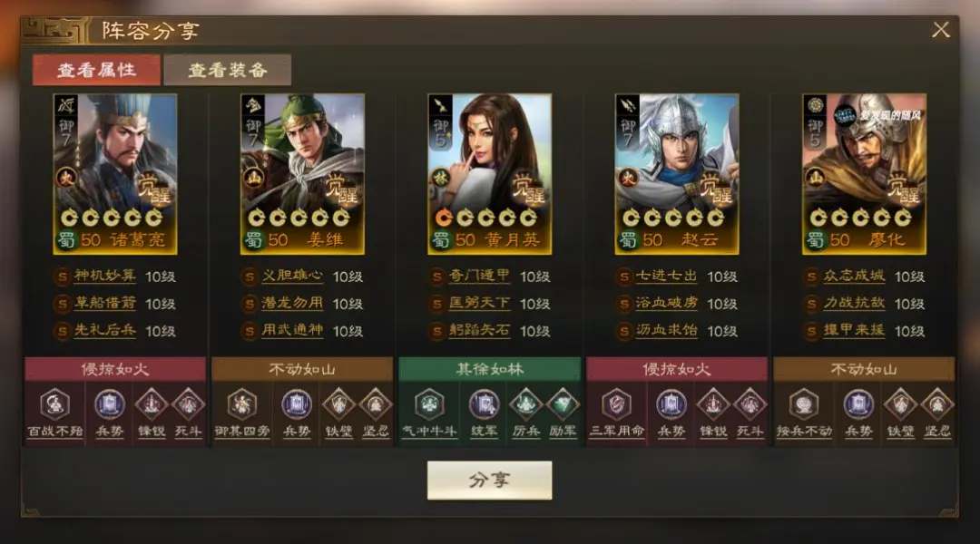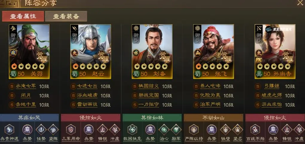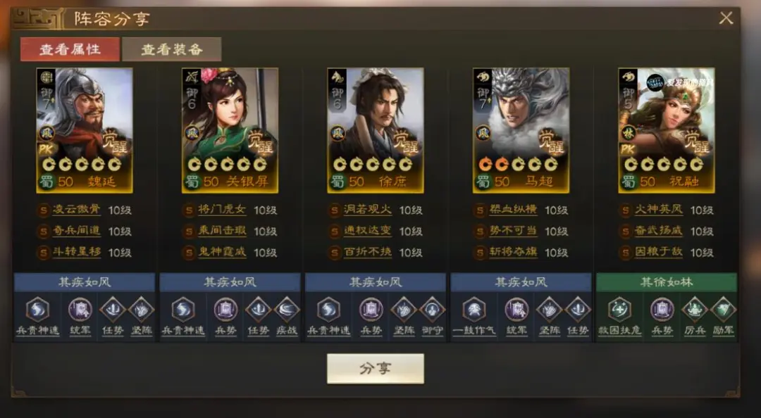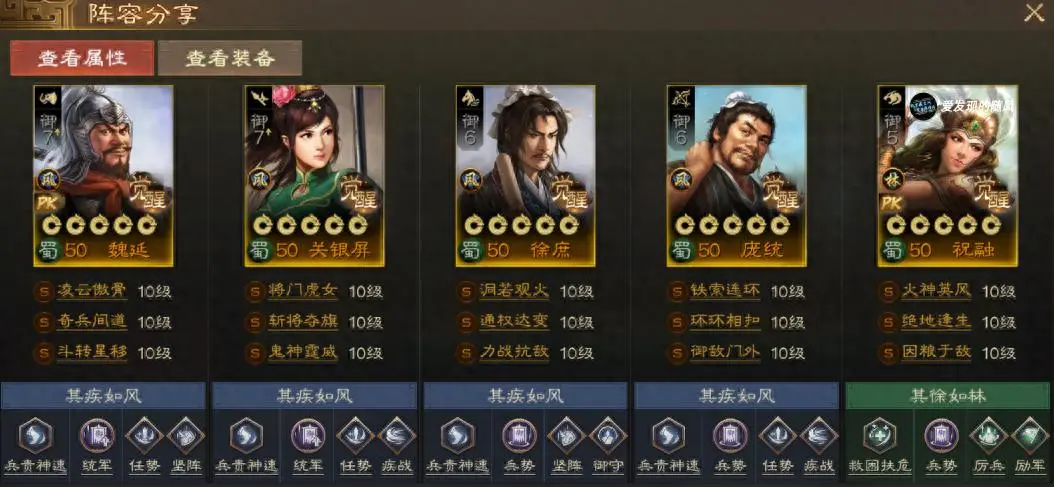 第五人除了庞统之外,用赵云的也不少,带势不可当+趁虚而入,当单点输出,也可以将趁虚而入换成瞒天过海/斩将夺旗。这里展示了祝融的另一种比较新的带法,带戮力同心,给魏延或者关银屏绑,存活能力更强。